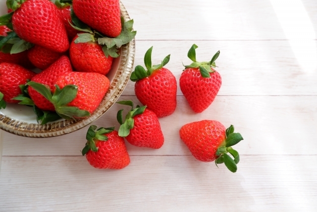 イチゴはビタミンCが豊富で風邪予防や美肌効果に期待できます。また、血を作るビタミンといわれている「葉酸」も豊富に含まれているので、貧血予防にも効果的。また、イチゴには血糖値の上昇やコレステロールの吸収を抑制する食物繊維のペクチンも含まれています。