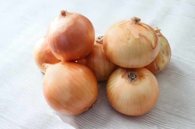 玉ねぎ(オニオン)は野菜の中で最も糖質が多く、果糖、ブドウ糖、ショ糖、カリウム、亜鉛、リン、ビタミンB1、B2、Cなどを含みます。玉ねぎの刺激成分である硫化アリルは揮発性の高い成分で、玉ねぎを切った時に涙がでるのはこの成分が原因です。硫化アリルは加熱すると糖度の高いプロピルメルカプタンに変化し甘くなるのはこのためです